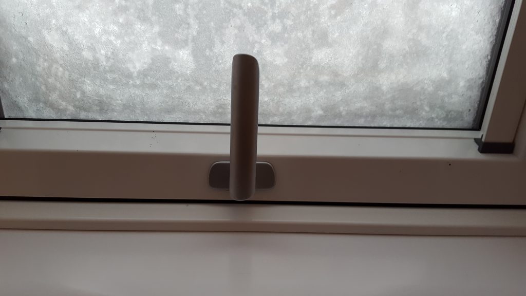 Dachfenster: Hebel nach oben = Fenster kann mit Druck nach oben geöffnet werden. Das Fenster ist mit dieser Hebelstellung ungesichert und kann durch Wind aufgedrückt werden.