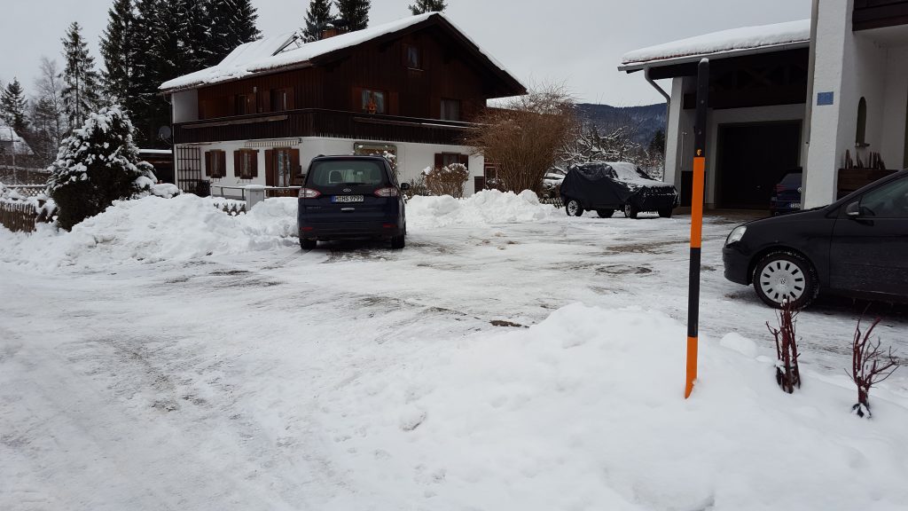 Die beiden Parkplätze ganz links gehören zu unserer Ferienwohnung. In der Regel nehmen wir Sie dort in Empfang oder Sie klingeln am Schild „Schwinghammer“ ganz oben.