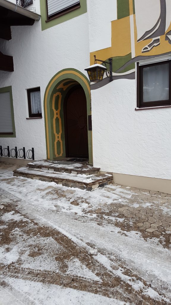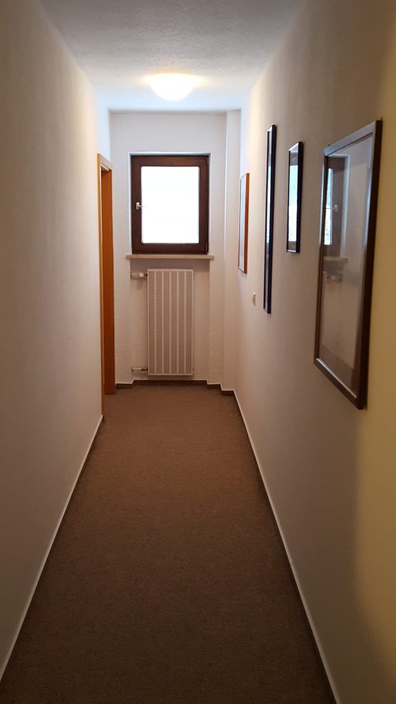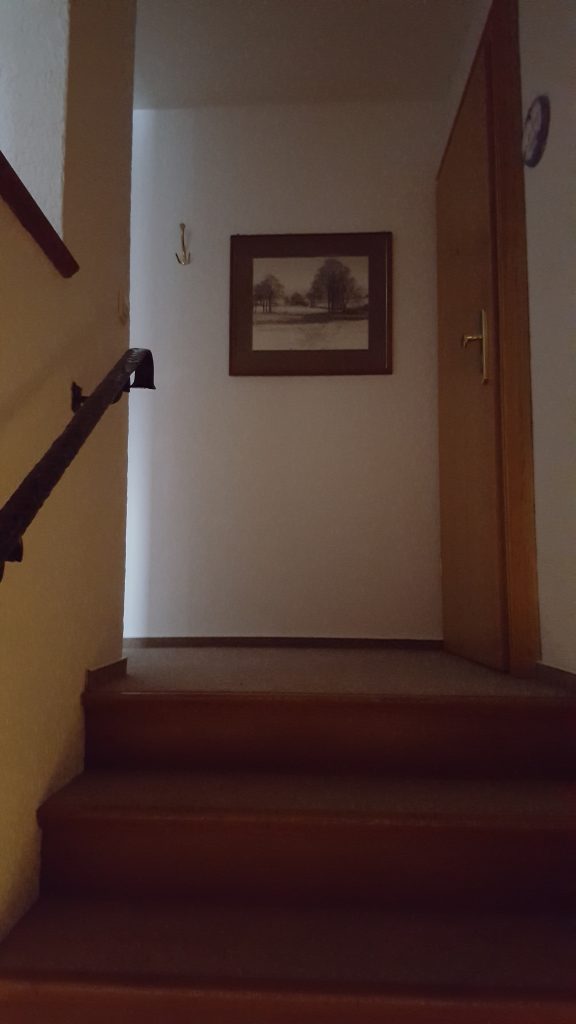 Am Ende des Gangs in Richtung Fenster sehen wir links die Wohnungstüre zu unserer Ferienwohnung. Es sind zwei Schlösser vorhanden, zu denen Sie für das untere einen Schlüssel an Ihrem Schlüsselbund finden. Das obere Schloss können Sie von innen blockieren. In der Wohnung gehen wir eine weitere Treppe in die 2. Etage hoch.