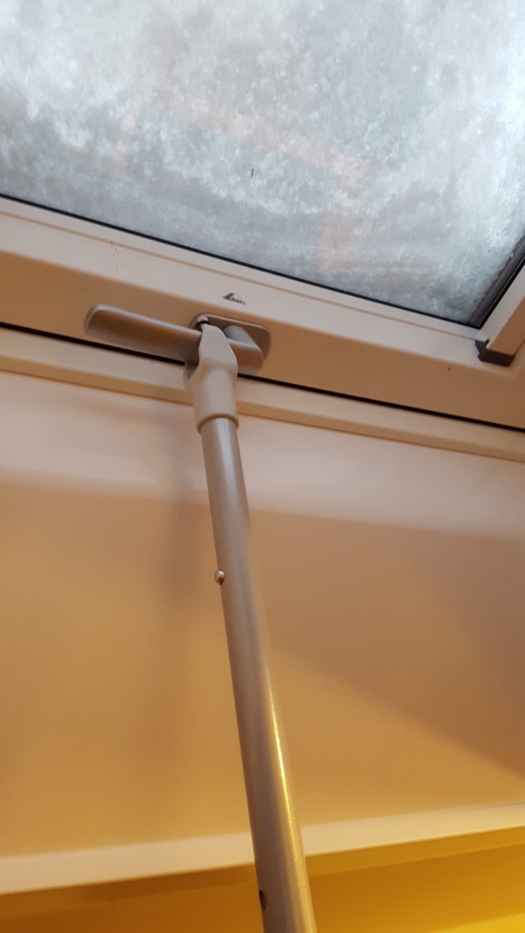 Dachfenster: In der Küche ist das Dachfenster relativ weit oben. Sie können das Fenster trotzdem bequem mit einem speziellen Stab bedienen, den Sie unter dem Fenster links in der Ecke finden.