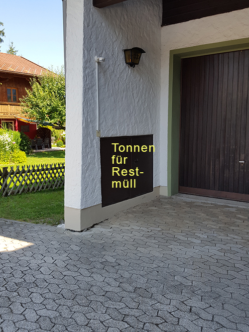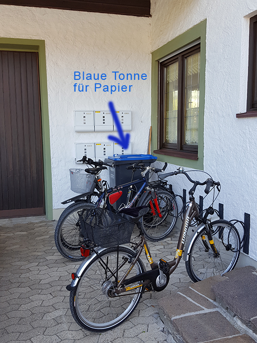 Der Restmüll wird in die grauen Tonnen gebracht (links neben den Garagen) und für das Papier steht rechts neben den Garagen eine blaue Tonne bereit.
